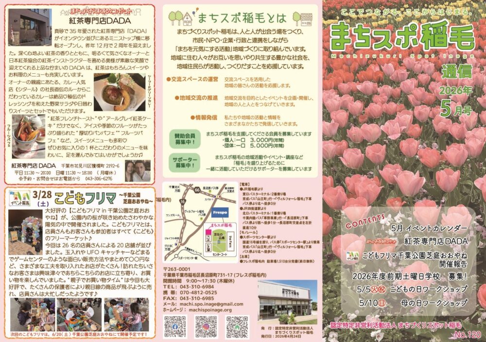 認定特定非営利活動法人 まちづくりスポット稲毛 〒263-0001 千葉県千葉市稲毛区長沼原町731-17 フレスポ稲毛内 開館時間:9:00~17:30(毎週木曜日休館) FAX: 043-310-6985 E-mail:machi.spo.inage@gmail.com